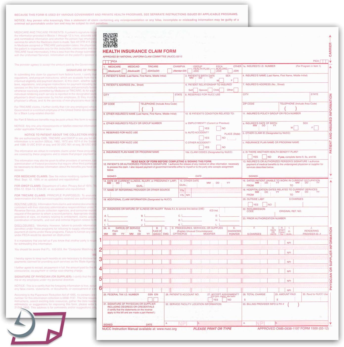- 1-Part 8-1/2" X 11" Laser Form CMS-1500, Printed in Red Ink