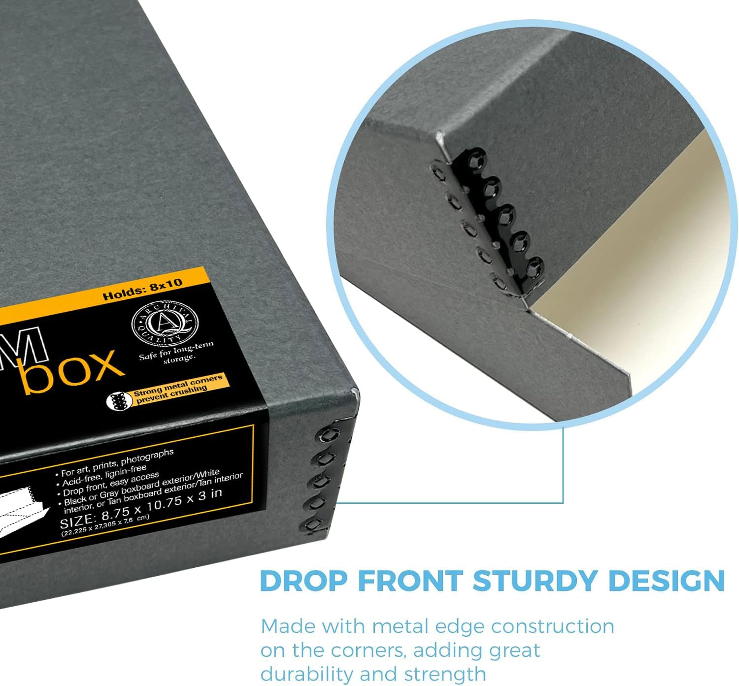 Lineco Museum Archival Storage Box, 8.75x10.75x3 in. Drop Front Design. Acid-Free with Metal Edge. Organize Photos, Pictures, Prints, Documents, Crafts, DIY. Gray, 1 Pack