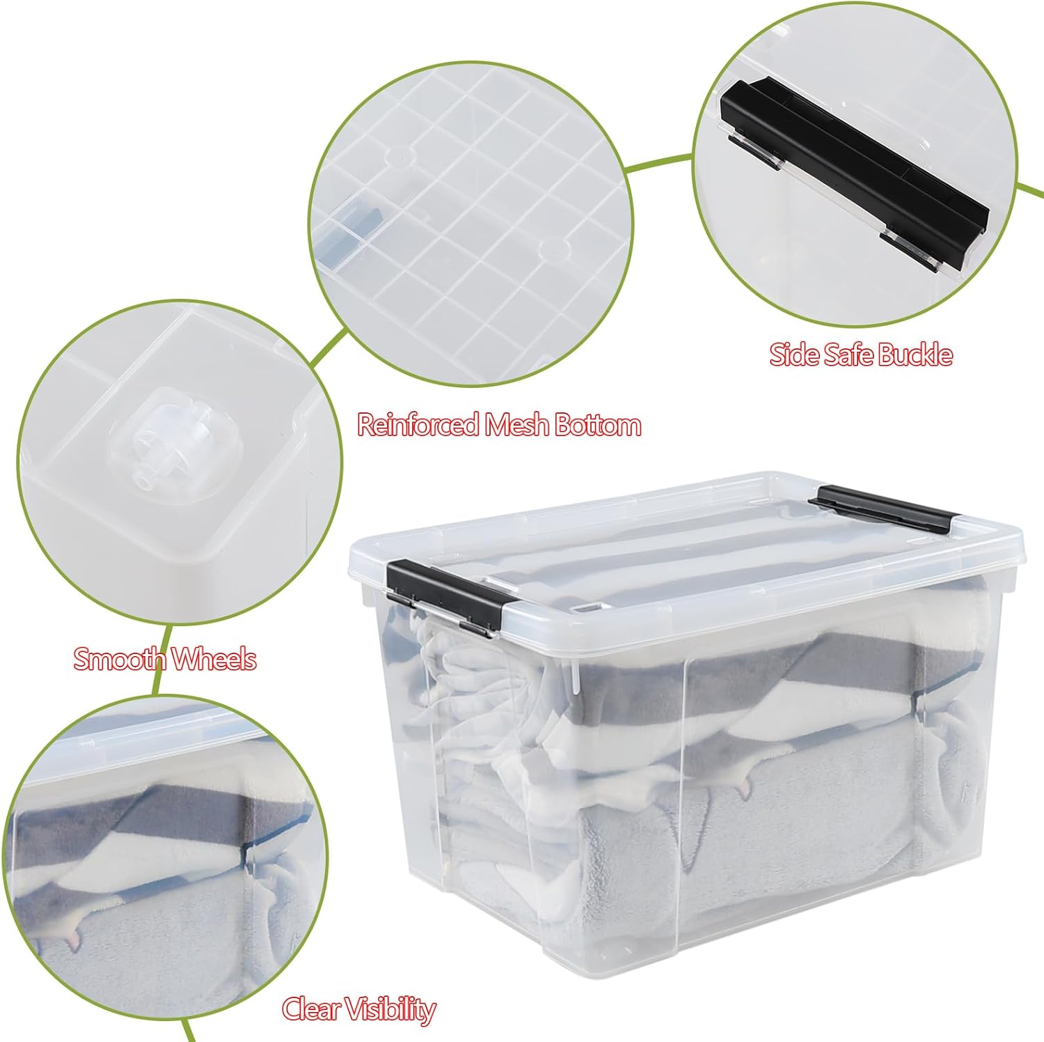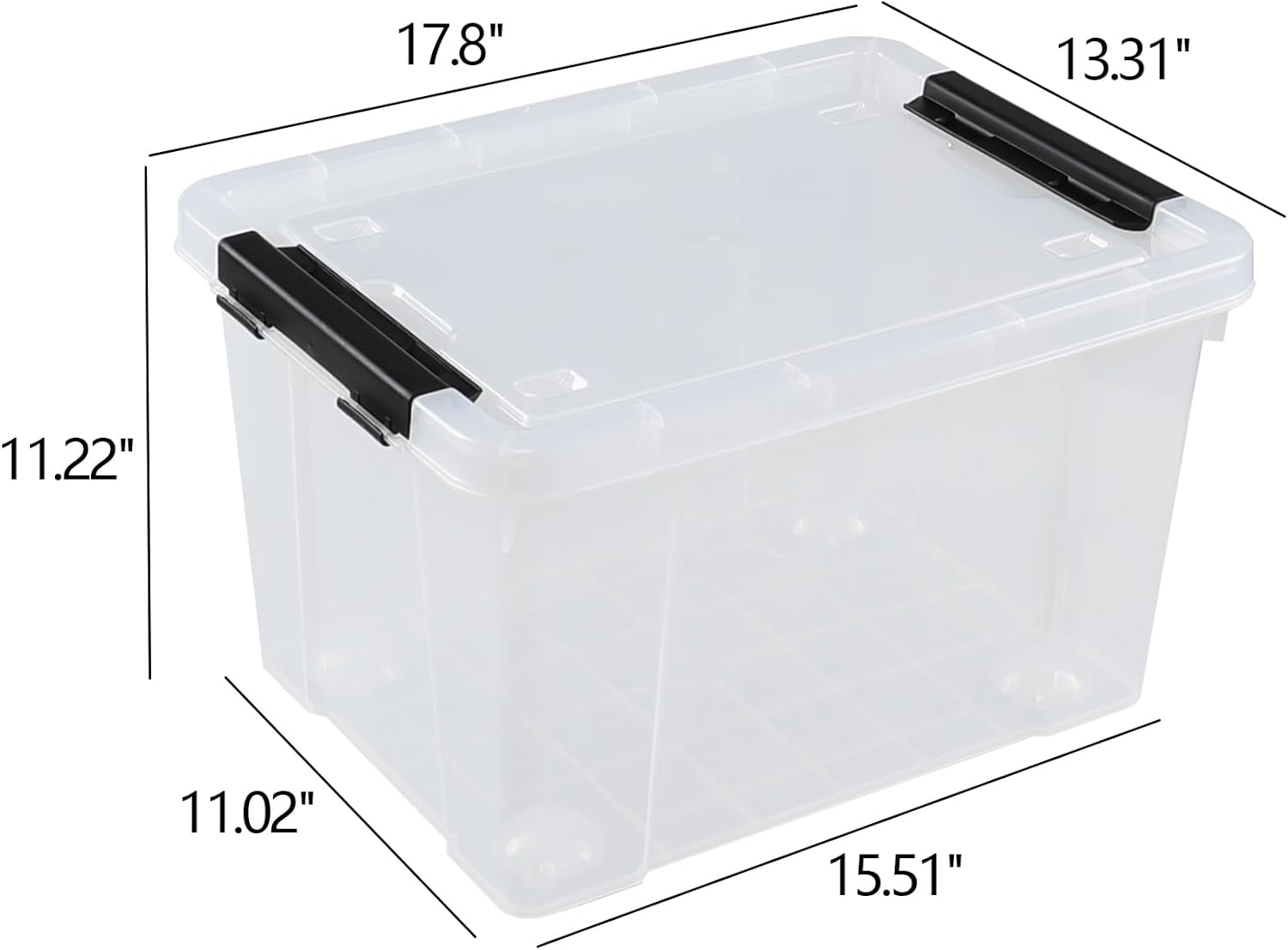 - Sturdy clear plastic storage bin with black latch to securely hold your items inside
