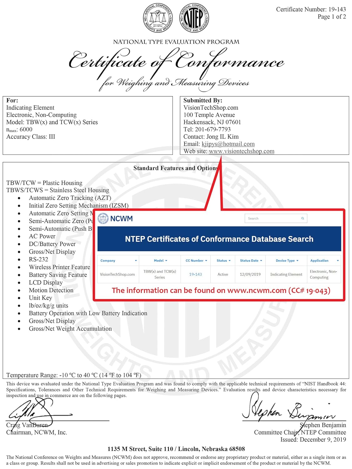 - Lb/Kg/Oz Switchable, Easy Operating, Adapter included, Built-in Rechargeable Battery, NTEP Certificate, Indicator CC# : 19-143, Platform, CC# : 19-144