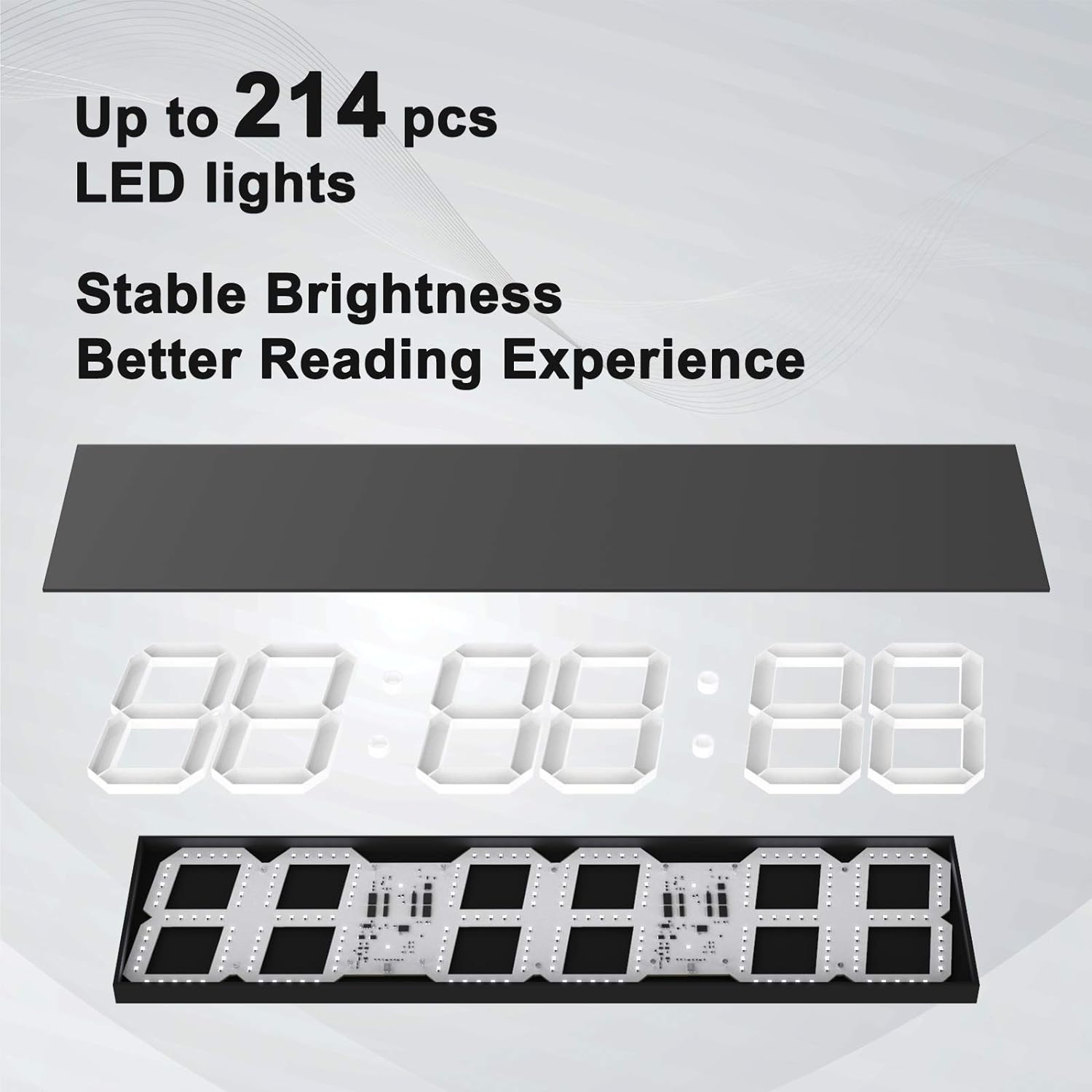 - Better Material for the Large Digital Wall Clock: The digital clock display board cover is made of acrylic, the shell is made of high-strength integration ABS material, ensure the digital clock is light and strong. 214 pcs Led lights of the clock, make sure of your reading experience.The big digital clock is powered by a 10-foot power cord for more of your installation needs.