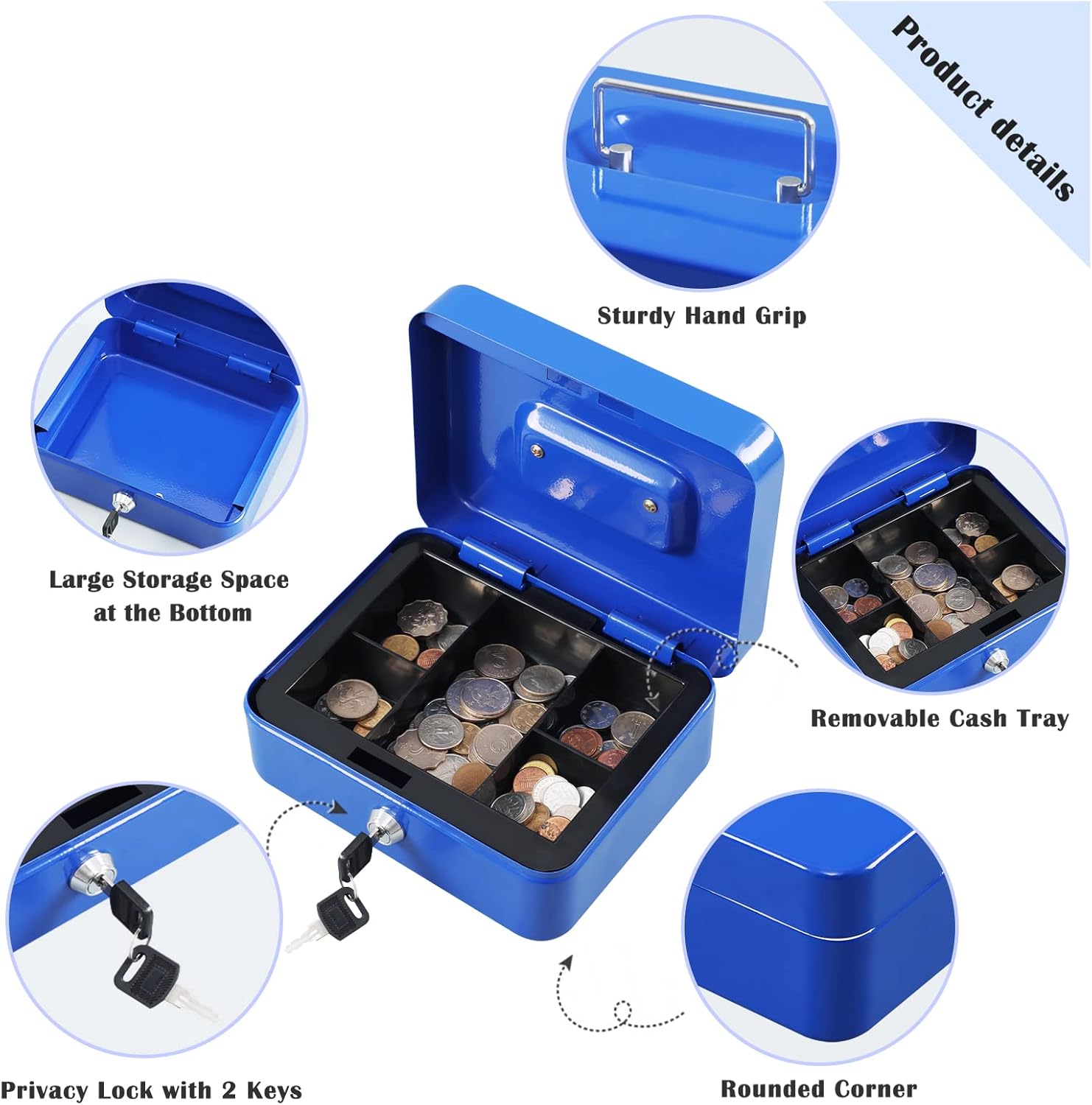 xydled Locking Steel Medium Cash Box with Removable Coin Tray and Key Lock,7.87"x 6.30"x 3.54",Blue