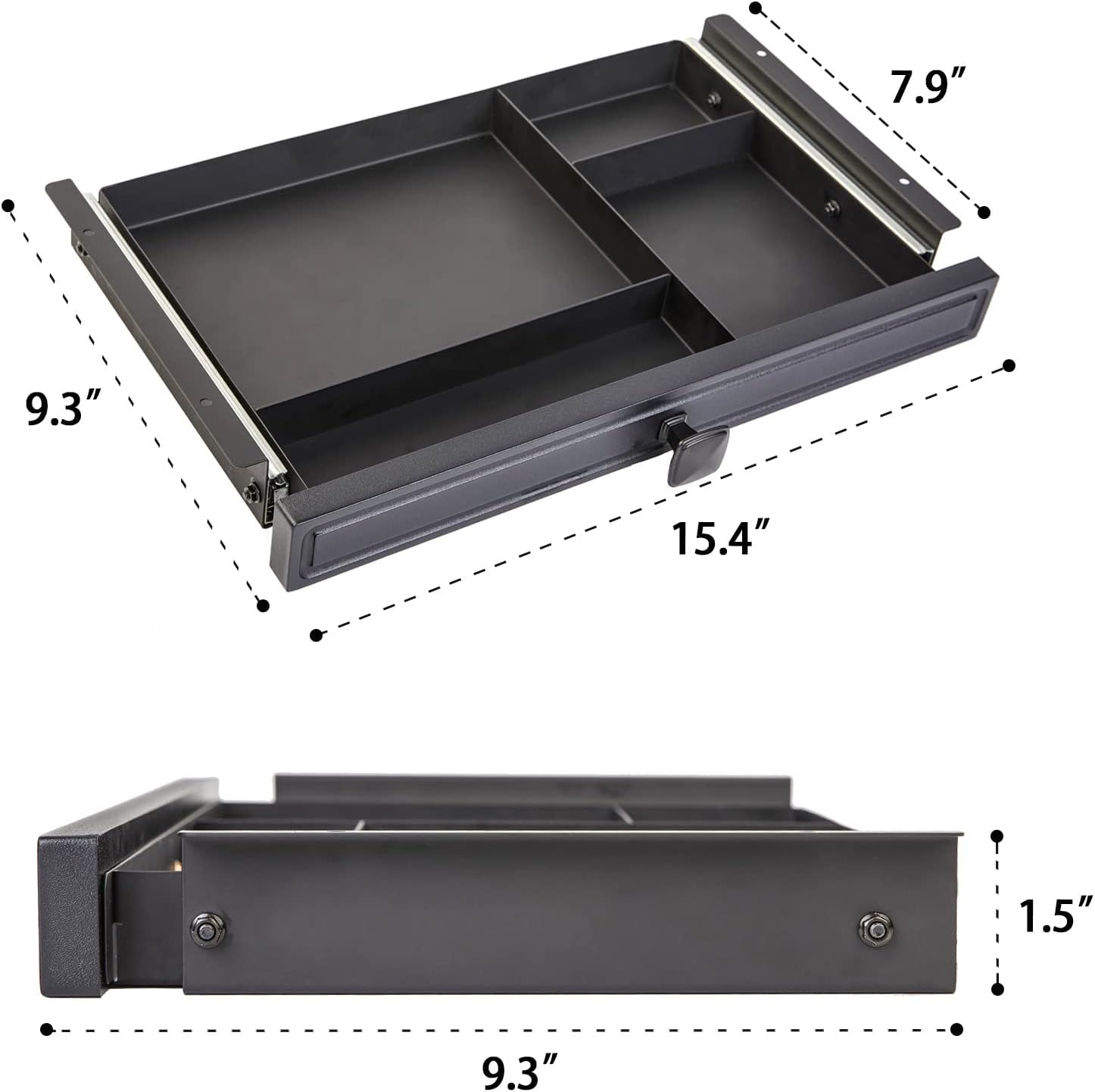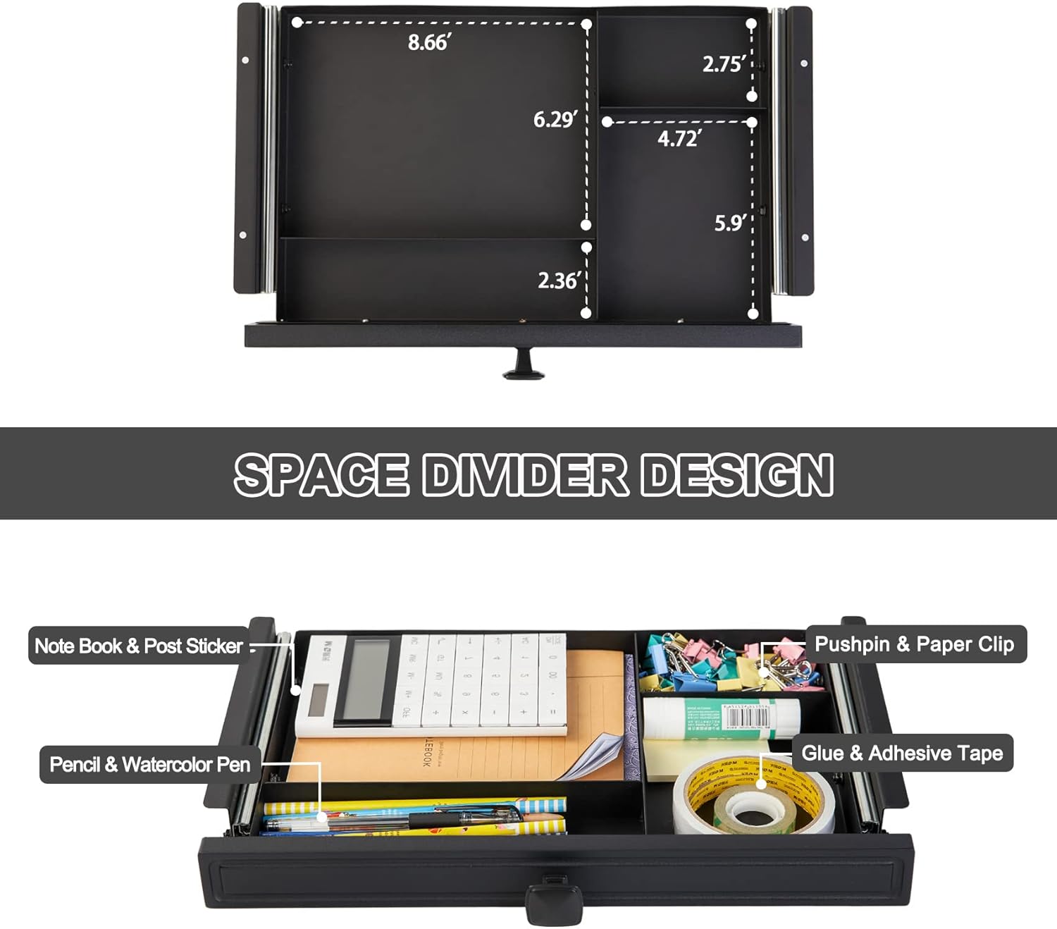 - 【Ergonomic Storage Solution】: 9.3" drawer depth is suitable for most standing desks; 1.5" drawer height will not affect your leg to desk space. The entire office drawer under the desk is 15.4 inches wide and has enough space for pencils, papers and standing desk accessories. Perfect for organizing your home office under desk storage or workstations in the bedroom, living room, dining room.