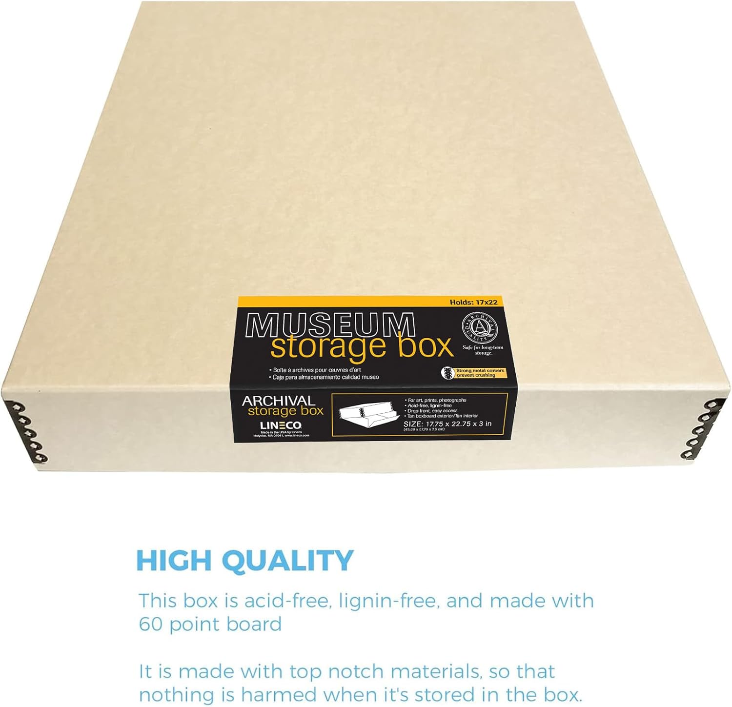 Lineco Museum Archival Storage Box, 17.75x22.75x3 in. Drop Front Design. Acid-Free with Metal Edge. Organize Photos, Pictures, Prints, Documents, Crafts, DIY. Tan, 2 Pack