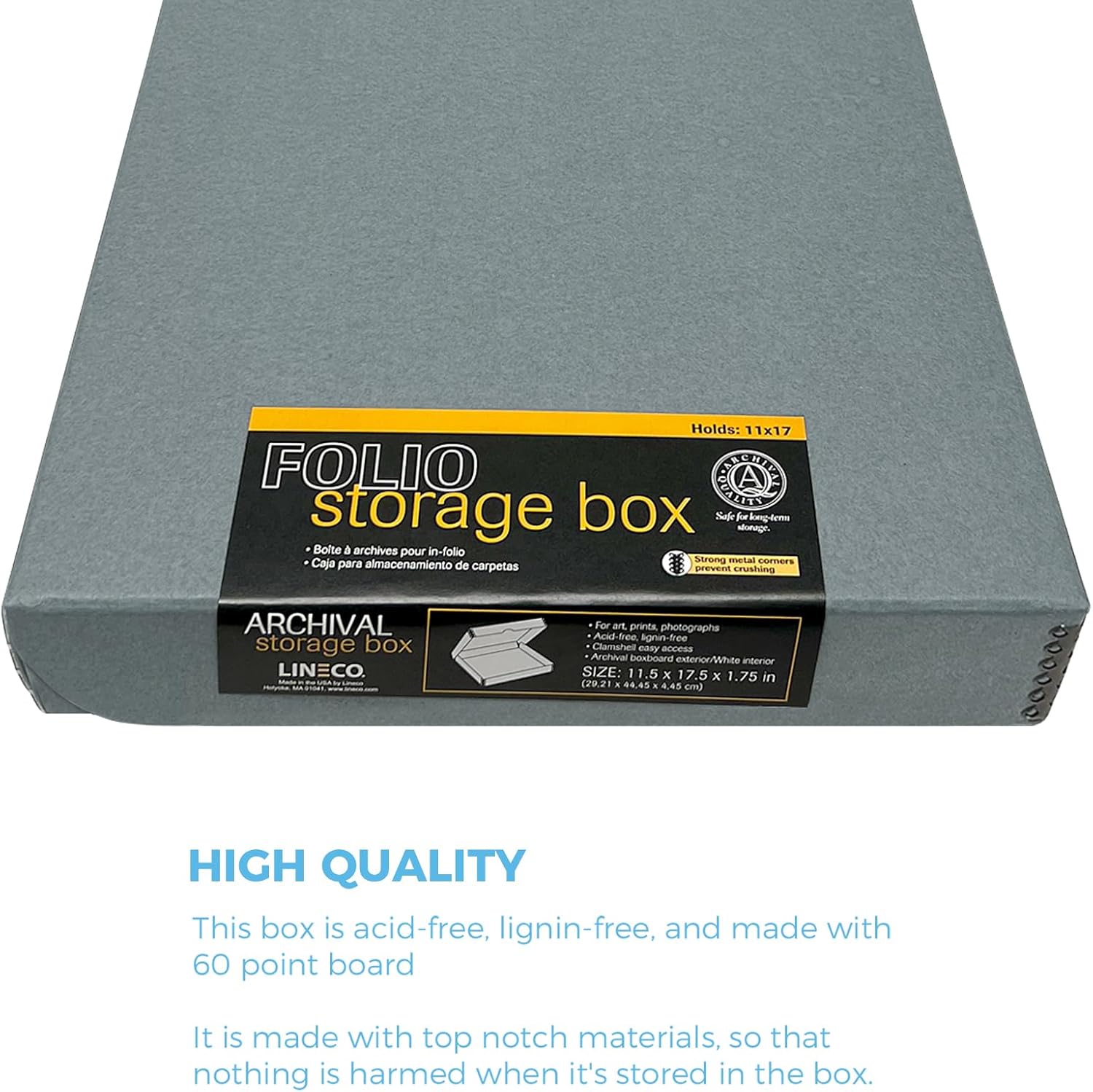 Lineco Folio Storage Box, Clamshell Design with Metal Edge. 11.5x17.5x1.75 Inches, Archival Boxboard, Preserve Photos, Cards, Magazines, Documents, Art, Ephemera, Family Records, Gray, Pack of 2