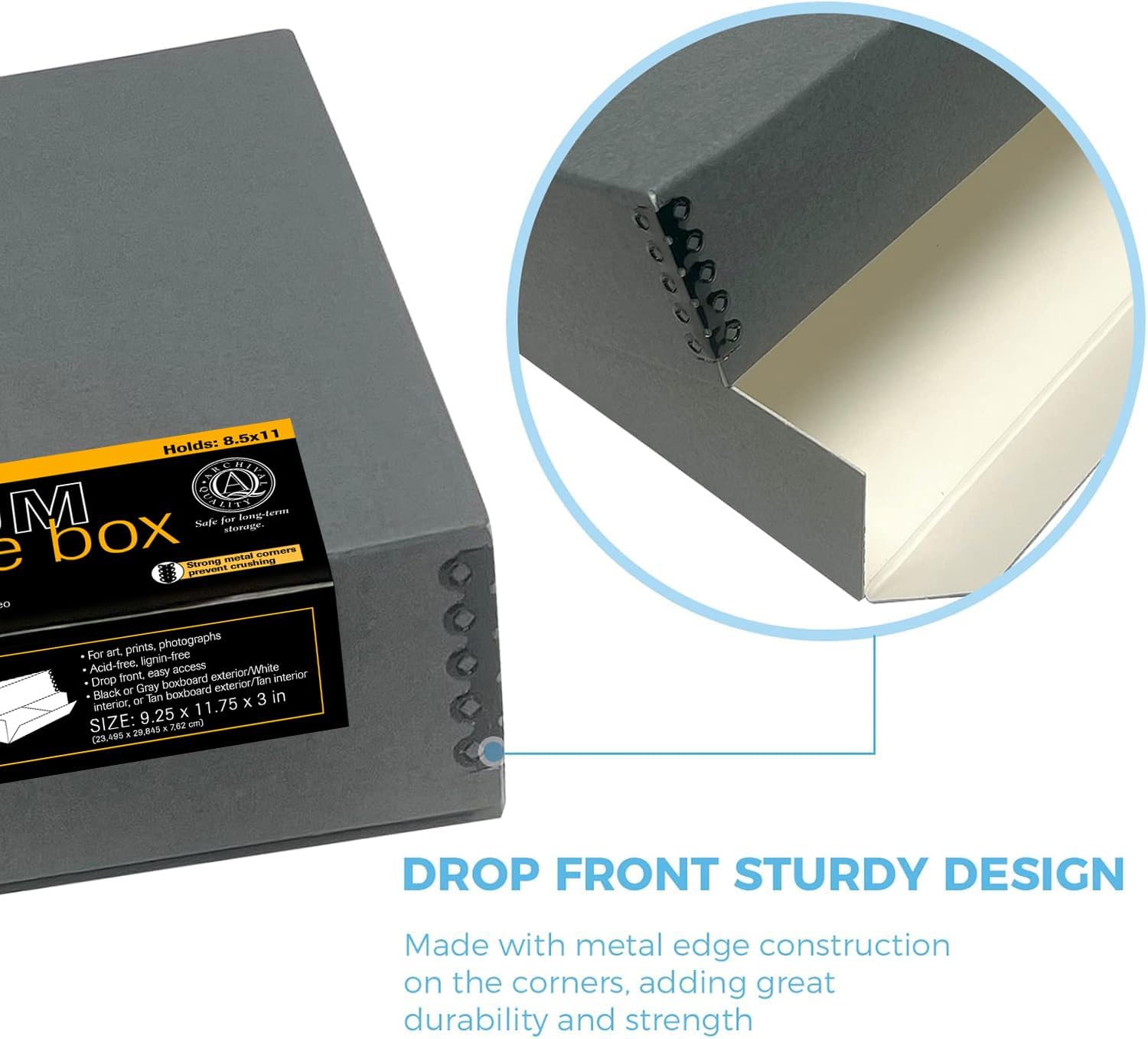 Lineco Museum Archival Storage Box, 9.25x11.75x3 in. Drop Front Design. Acid-Free with Metal Edge. Organize Photos, Pictures, Prints, Documents, Crafts, DIY. Gray, 2 Pack