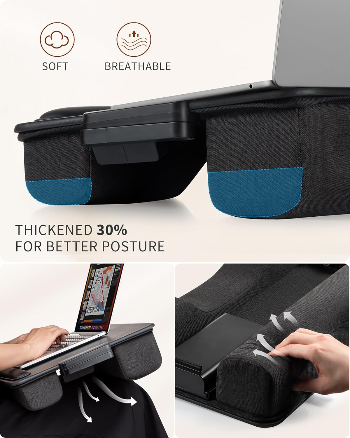 - Thickened Lap Desk Cushions: SAIJI Laptop Lap Desk design with 30% soft thickened cushion on the bottom, allow for a better angle when using laptop, and creat a larger space for air flows and laptop heat dissipation.