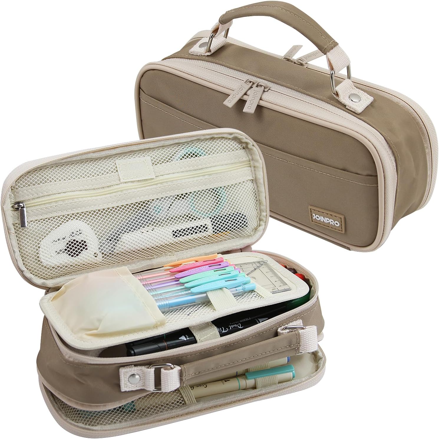 - Unique Designs - Fashionable colors and appearance, with three-dimensional and layered structure design. Two double-zipper, interior mesh pockets, and different compartments are designed for this pencil bag, it can hold pretty much everything a student needs. With rivet reinforcement handle strap design, not easy to break; and thickened handle strap for comfortable use and easy to carry.