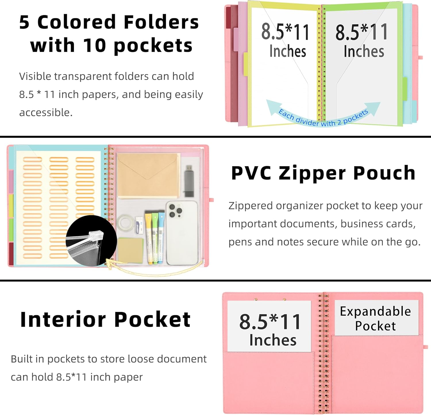 - 【Secure Storage】The portfolio organizer has a clear pouch with a zipper that provides a secure place to store documents, notes, or other items when you're on the go. The clipboard comes with 5 plastic folders that have 10 pockets, fitting all standard US letter-size sheets (11" x 8.5"). It is a great way to keep your papers organized and easily accessible.