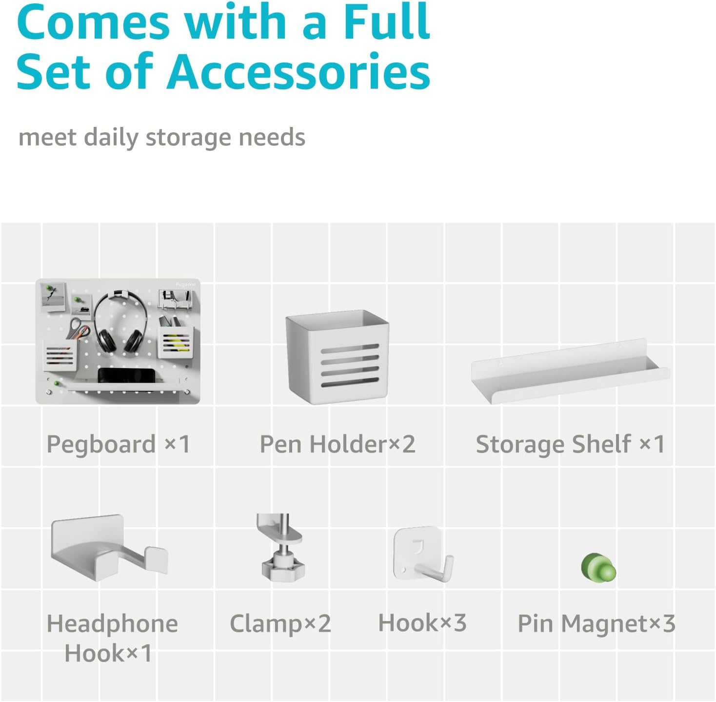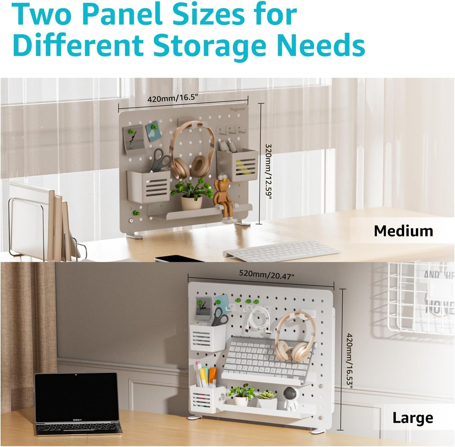 - MULTIPLE ACCESSORIES: The two sizes available allow you to choose the perfect fit for your needs, while the wide range of accessories ensures that you can personalize your organization system. Our desk organizer set includes storage shelf, pin magnets, hooks, pen holders and headphone hook.