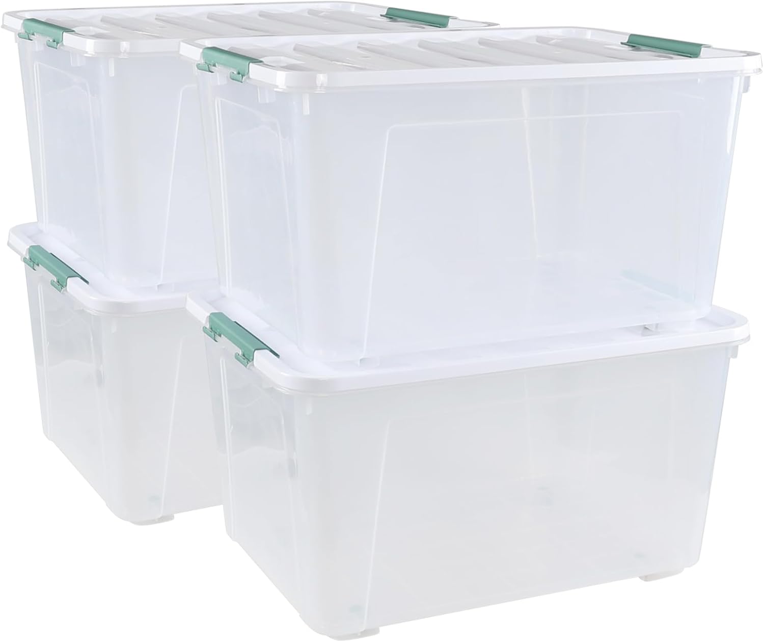 80 L Large Plastic Storage Bins with Lids, 4 Pack Wheeled Clear Storage tote with Latch Handle
