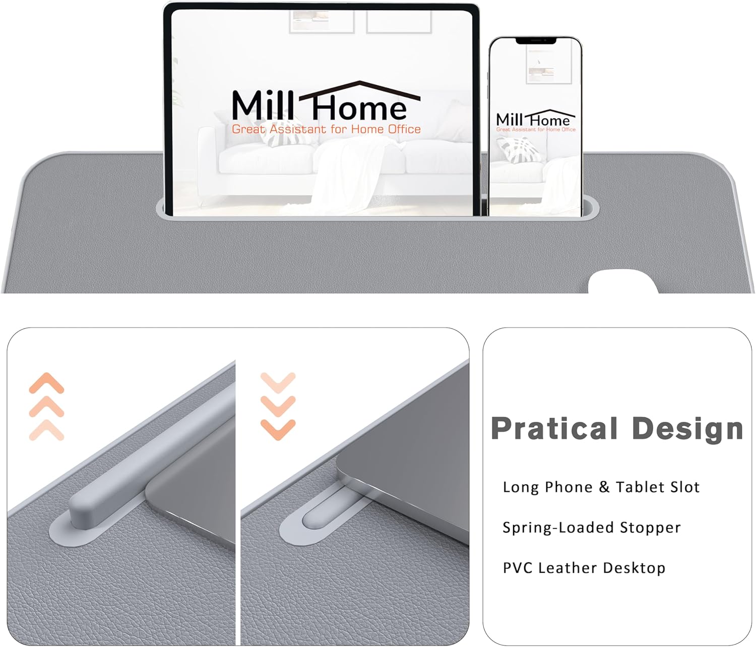 - PRACTICAL DESIGN: The laptop lap desk comes with a spring-loaded stopper to keep your laptop in place, PVC Leather covered the whole desktop, while a media slot lets you put your phone or tablet in. Besides, there is a pen holder under the desktop that holds the pen well.