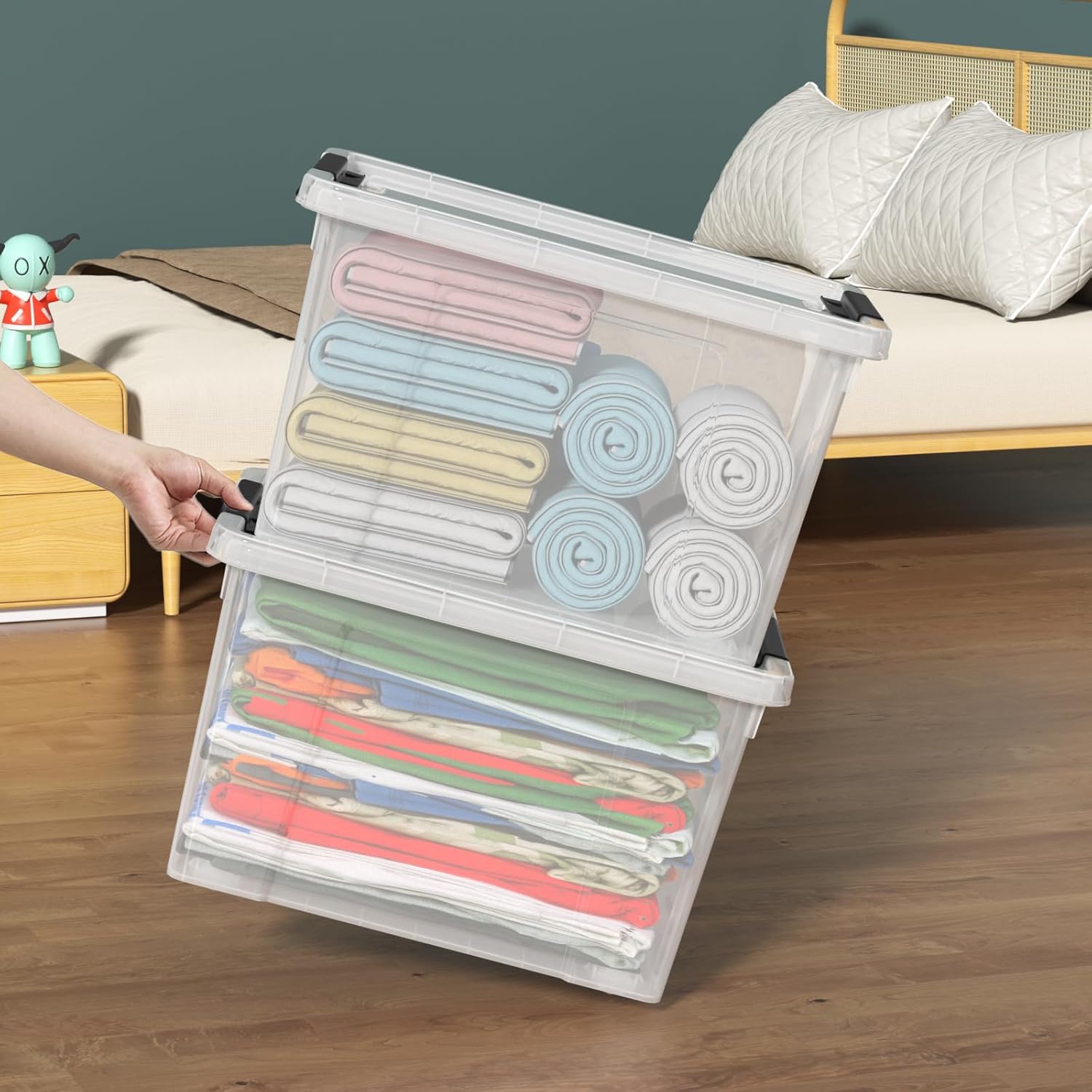 22 Quart Stackable Plastic Storage Bins with Lids and Latching Buckles, 4 Pack Tubs Boxes Organizing, Clear