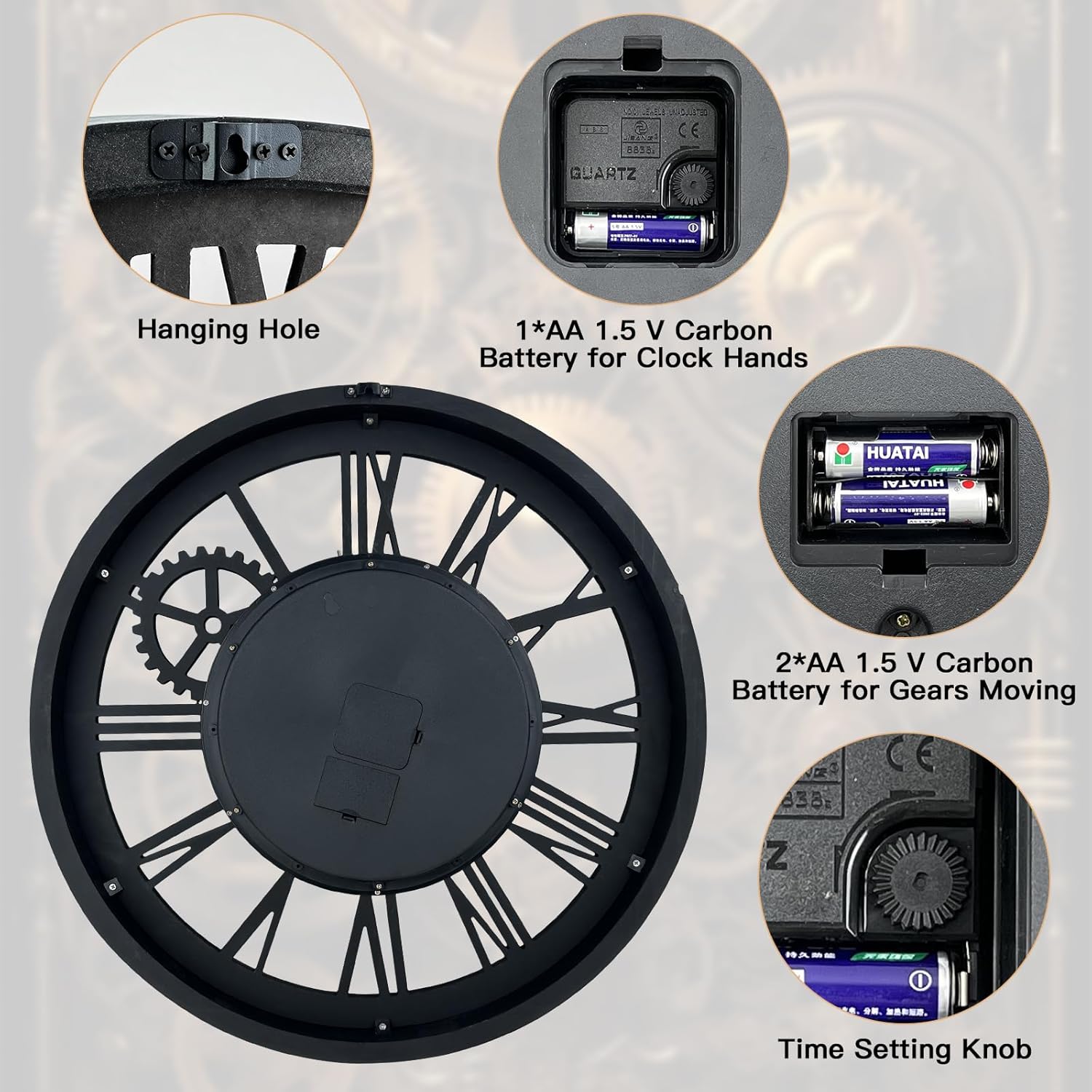 - ACCURATE TIME AND BATTERY OPERATED: Quality quartz sweeping mechanism for accurate time without any ticking sounds. Power by 3 AA Carbon battery operated (not included), large industrial clock takes 2 sets of batteries, one set for the clock and the other for gears that spin. Both of them can be used individually
