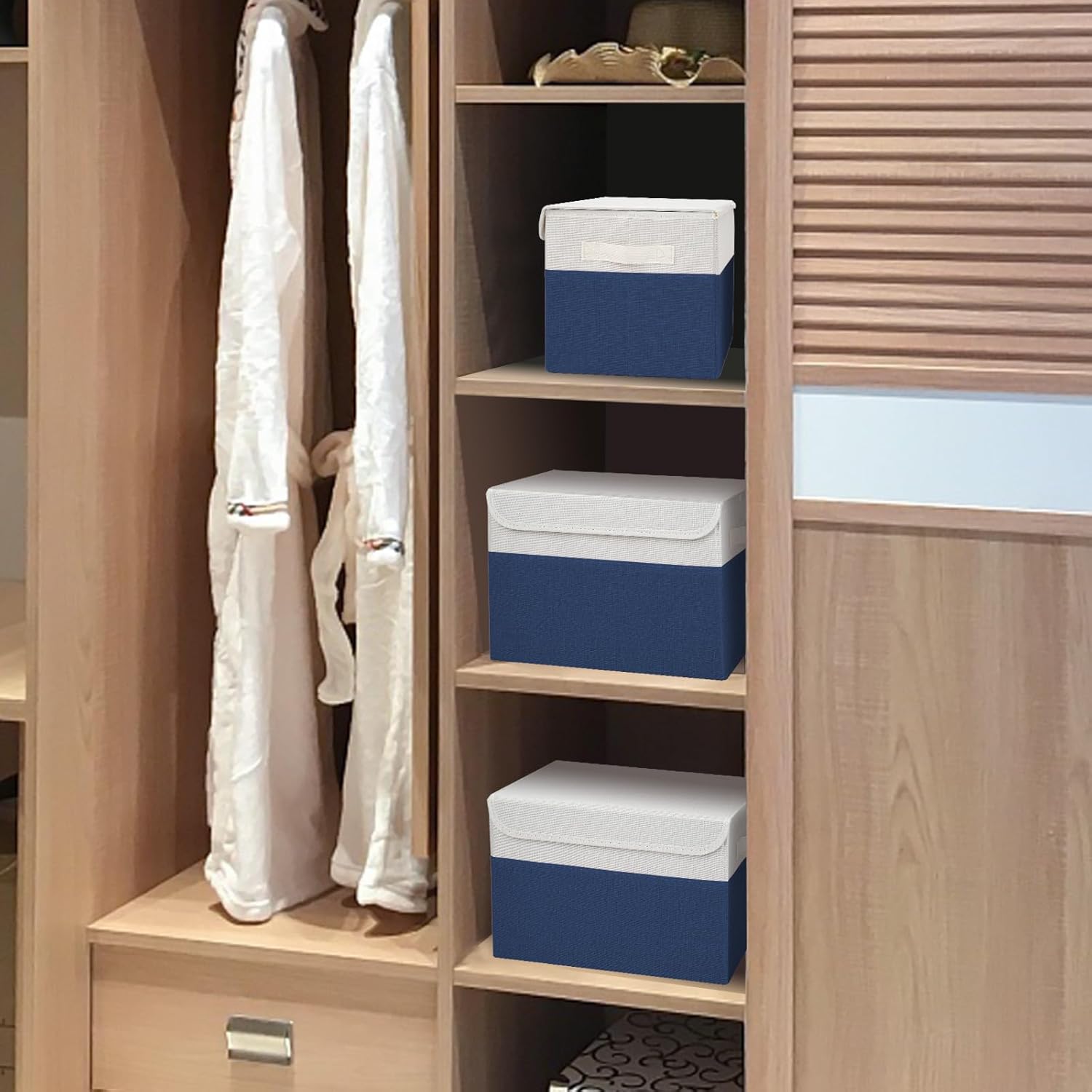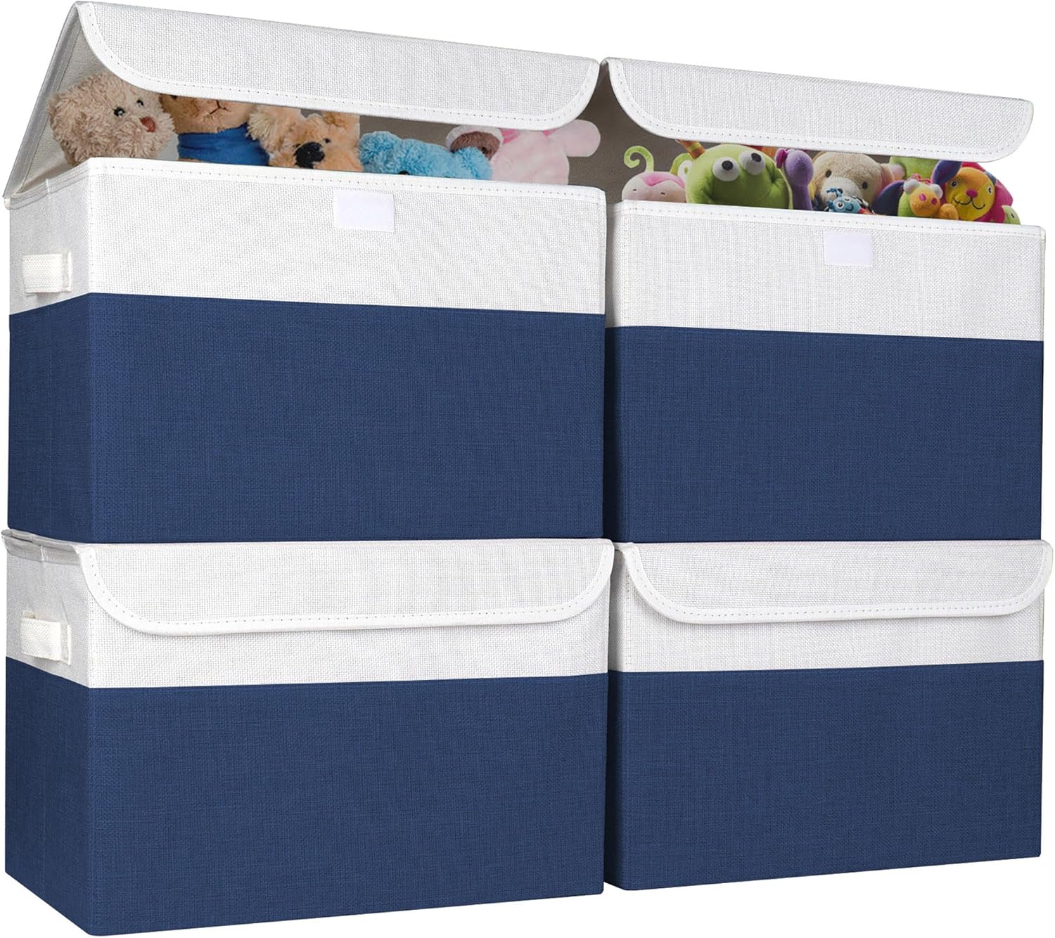 Large 22 Quart Linen Fabric Foldable Storage Bin Cube Organizer Basket with Flip-Top Lid & Handles, Clothes Blanket Box for Home, Office, Closet, Navy Blue & White, 4 Pack 14.6 x 9.5 x 9.5