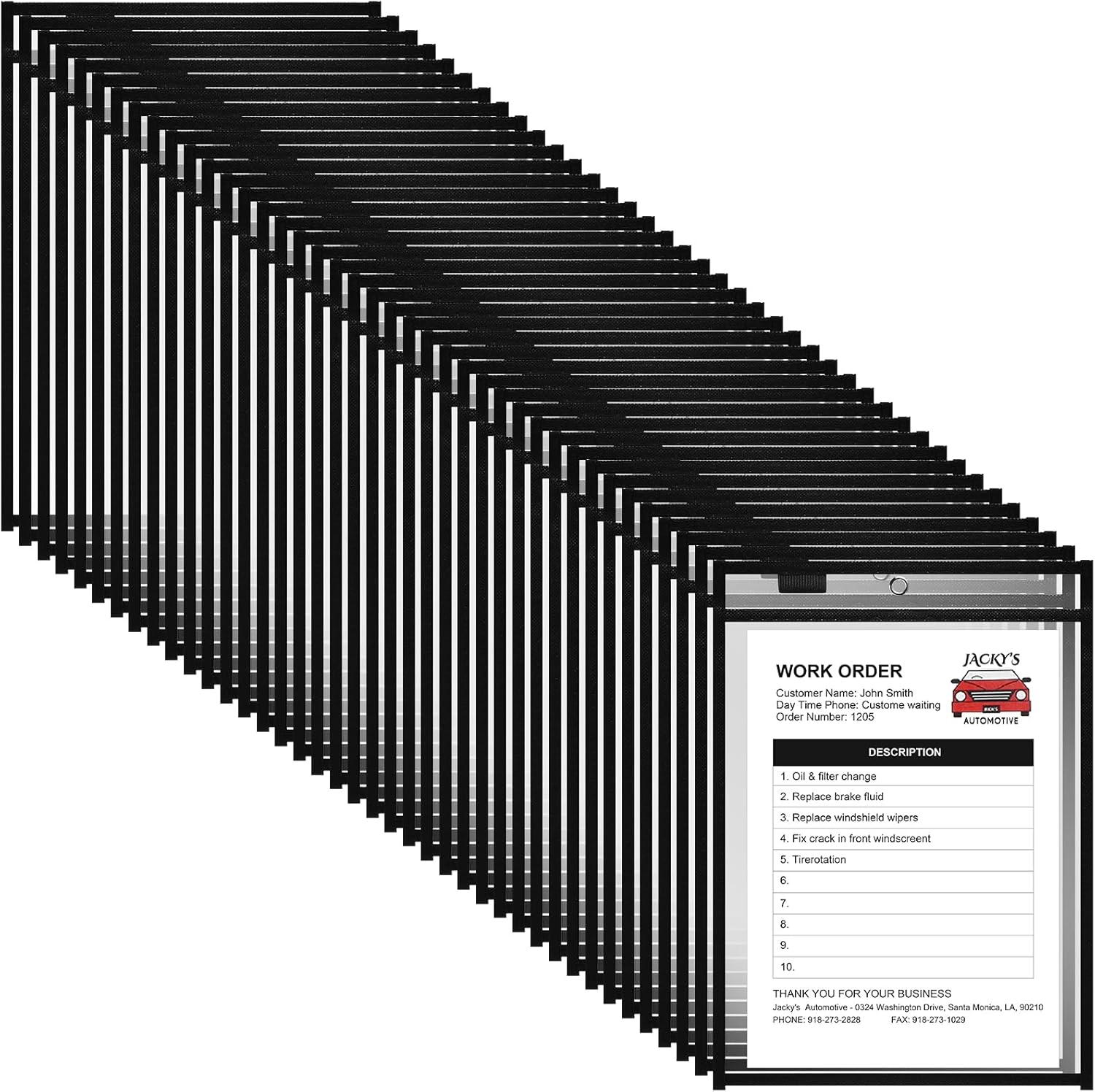 Nezyo Dry Erase Pockets Plastic Job Ticket Holders Shop Holder Order Pockets Clear Sleeves Tickets Folders Plastic Sleeves Paper Teacher Supplies for Classroom(12 x 9.5 in,Black,50 Pcs)
