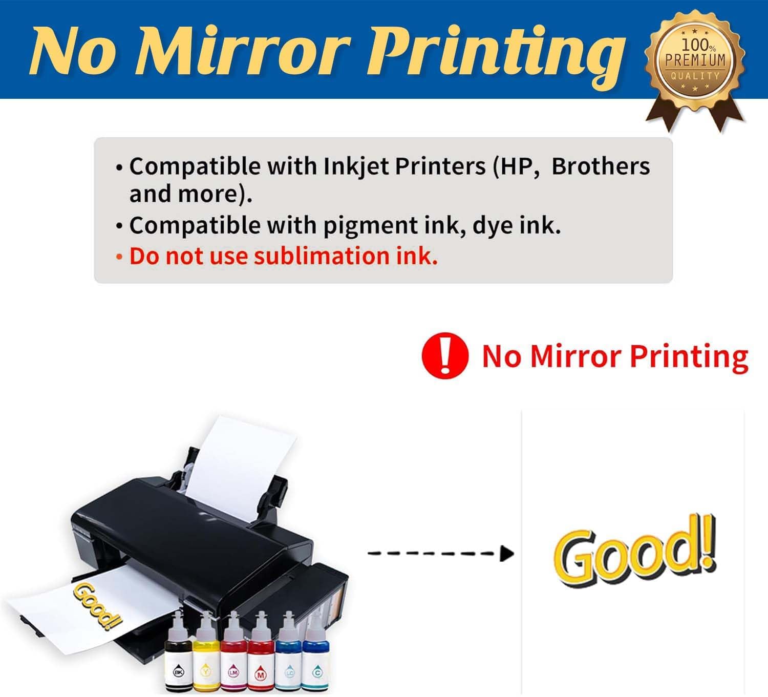 - 💕REQUIREMENTS: Inkjet Printers (such as HP, Brother and other brands) | Pigment Ink or Dye Ink (Do not use sublimation ink) | Scissors or Cutting Machine | Iron or Heat Press machine | Teflon Paper (included in the pack).